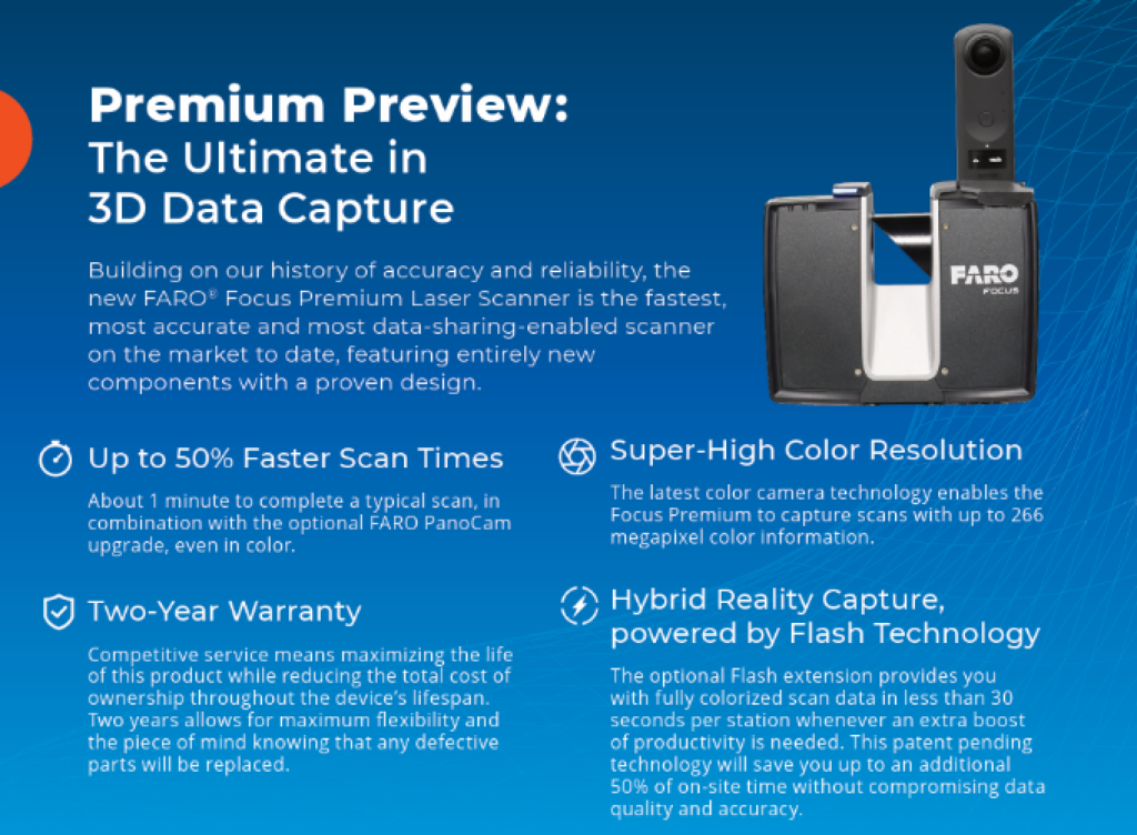 Focus Premium มอบประสิทธิภาพในการจับภาพที่โดดเด่นด้านความมีประสิทธิภาพในการเก็บข้อมูล คุณภาพข้อมูล และความแม่นยำสำหรับการใช้งานมืออาชีพในวงการก่อสร้าง ความปลอดภัยสาธารณะ การดำเนินงานและการบำรุง รักษา การผลิต พร้อมทั้งยังมอบคุณภาพข้อมูลที่ดีขึ้นในความเร็วในการสแกน (สูงสุด 1 นาทีต่อสแกน) เพื่อลดเวลา การสแกนได้สูงสุดถึง 50% และหากใช้งานร่วมกับแอปพลิเคชั่นมือถือ FARO Stream รุ่นใหม่ ที่รองรับการโหลดและ การตอบสนองของระบบที่เร็วขึ้น และอัปโหลดไปยังแพลตฟอร์มบนคลาวด์ FARO Sphere ด้วยลูกเล่นอันทรงพลัง นี้ส่งผลให้มีประสิทธิภาพในการจัดการข้อมูลมากขึ้น
