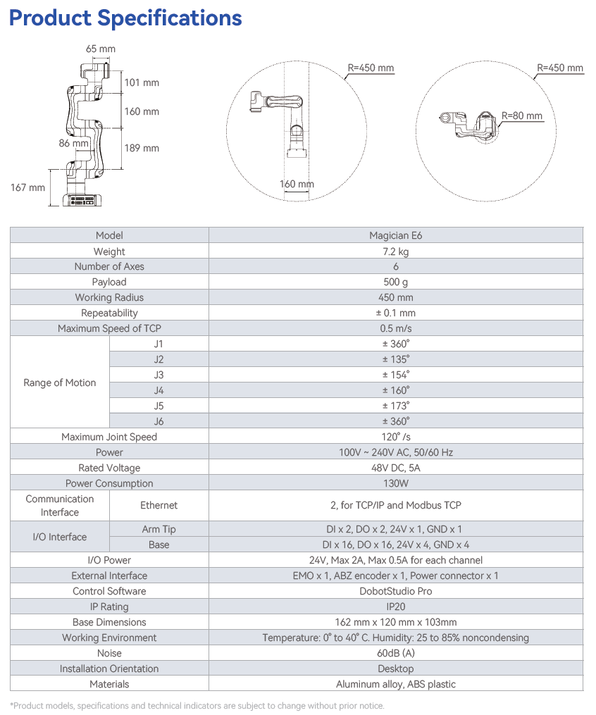 DOBOT Magician E6 เป็นหุ่นยนต์แขนกลแบบ 6 แกน ขนาดตั้งโต๊ะ ที่ออกแบบมาเพื่อการเรียนรู้และการวิจัยด้านหุ่นยนต์ ปัญญาประดิษฐ์ และระบบอัตโนมัติ ด้วยดีไซน์กะทัดรัด ปลอดภัย และใช้งานง่าย จึงเป็นเครื่องมือที่เหมาะสำหรับการพัฒนาทักษะในโลกยุคดิจิทัล